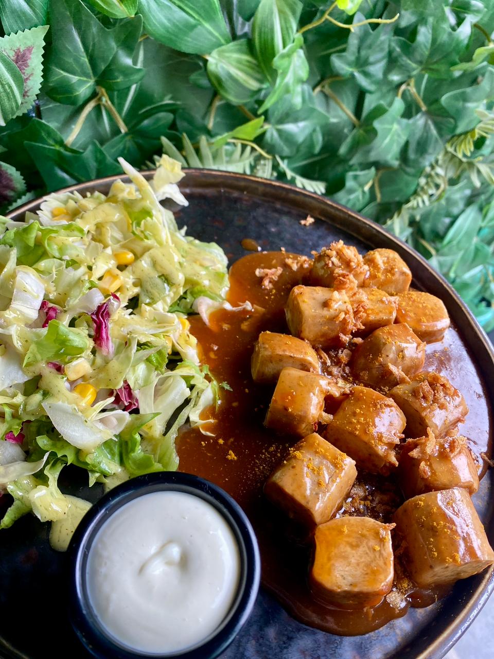 Escalope de soja, salade iceberg, gouda, oignons rouges crus, sauce relish maison